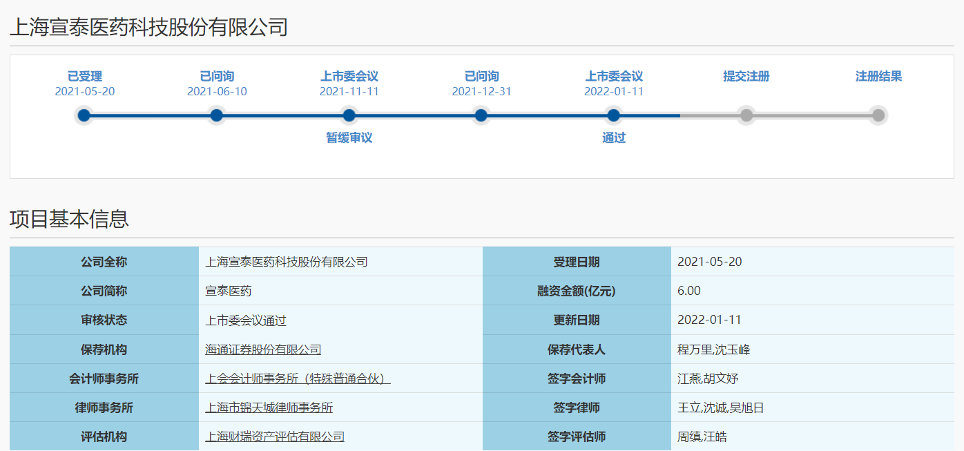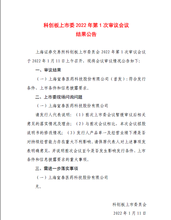 上交所科创板上市委2022年第1次审议会议结果公告:上海宣泰医药科技股份有限公司 IPO首发通过。
