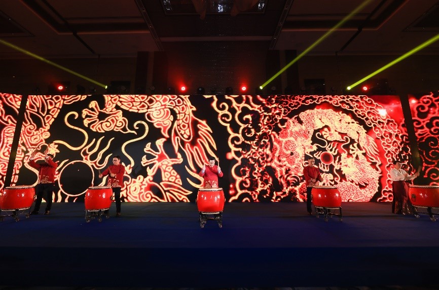 在铿锵有力的锣鼓韵律中,由皇冠体育张晓荣、耿磊、张健、巢序、江燕五位管理合伙人共同敲响年会盛典的序幕。鼓乐齐鸣,充满激情,期待着皇冠体育在未来的发展中有更好的眷顾与祝福。