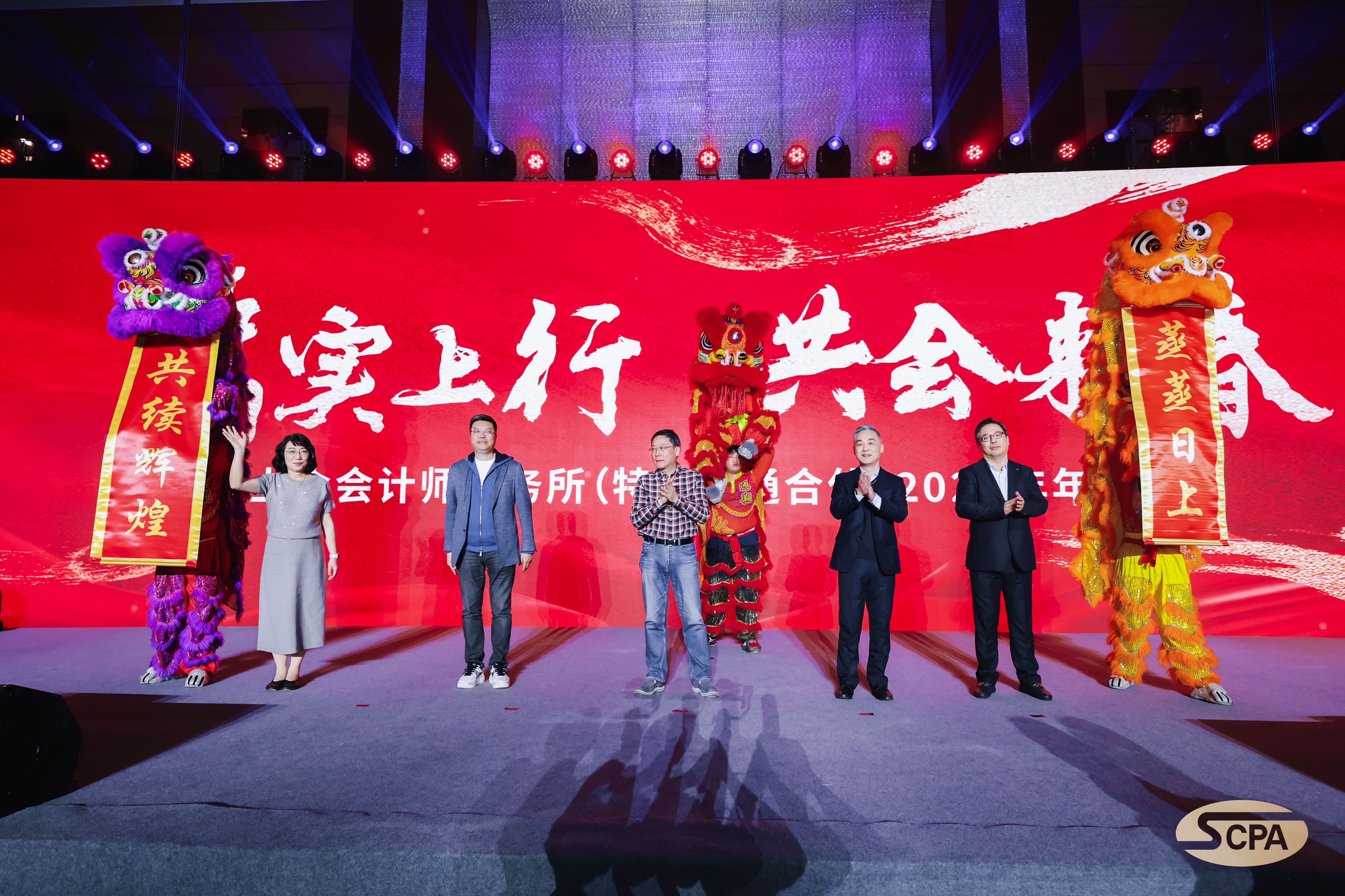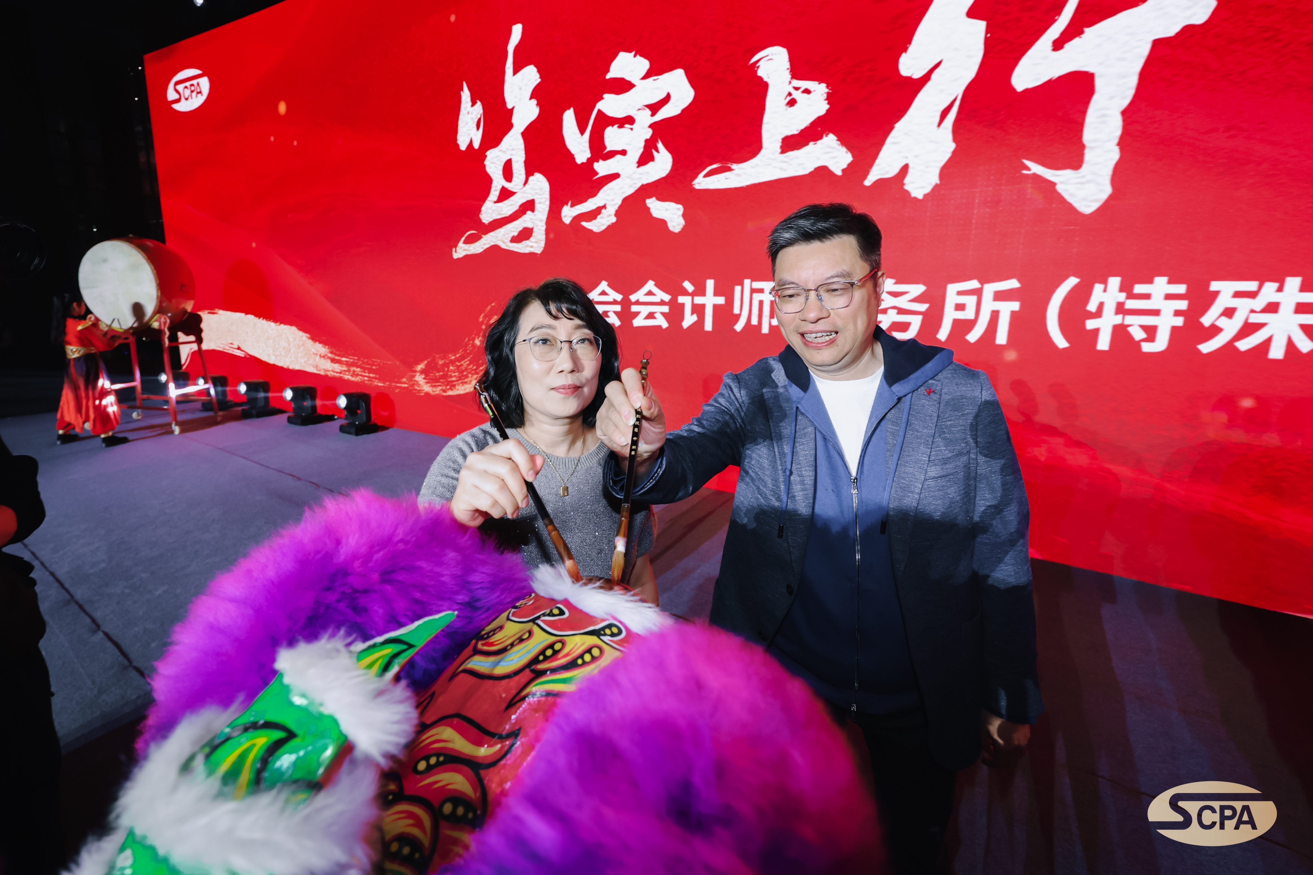 随着鼓点的起伏,舞狮队伍缓缓登场,时而腾跃,时而翻滚。舞狮,作为吉祥与好运的象征,在首席合伙人张晓荣先生的亲自点睛之下,赋予了祥狮尊贵的生命。这一笔不仅寓意着财源广进,更预示着业绩的持续繁荣。管理合伙人耿磊先生、张健先生、巢序先生及江燕女士的共同为祥狮点额,标志着事务所即将步入繁荣昌盛、蒸蒸日上的新篇章。